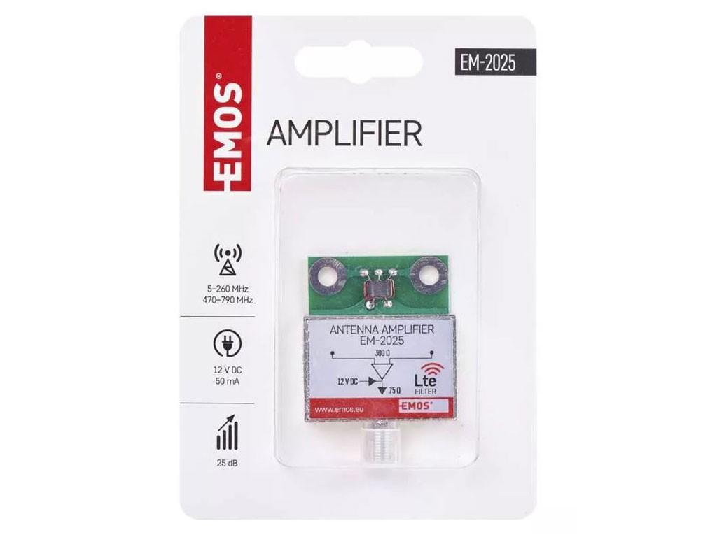 Anténny zosilňovač EM-2025 je určený pre DVB-T a ponúka zosilnenie 25 dB. Je napájaný 12V a má konektor typu F, čo uľahčuje montáž do antény typu sieť. Tento model je vybavený LTE filtrom, ktorý eliminuje rušenie z mobilných sietí.