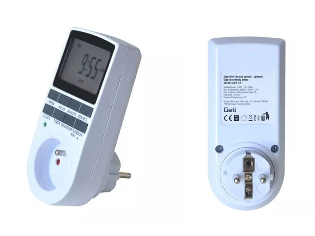 Digitálne spínacie hodiny Geti GDT02 umožňujú automatické zapínanie a vypínanie sieťových spotrebičov v nastavených časových intervaloch. Tieto hodiny ponúkajú denný i týždenný spínací cyklus s 10 programami, jednoduché ovládanie a funkciu DST (letný čas) a RANDOM (náhodné spínanie). Maximálny spínaný výkon činí 3680W.