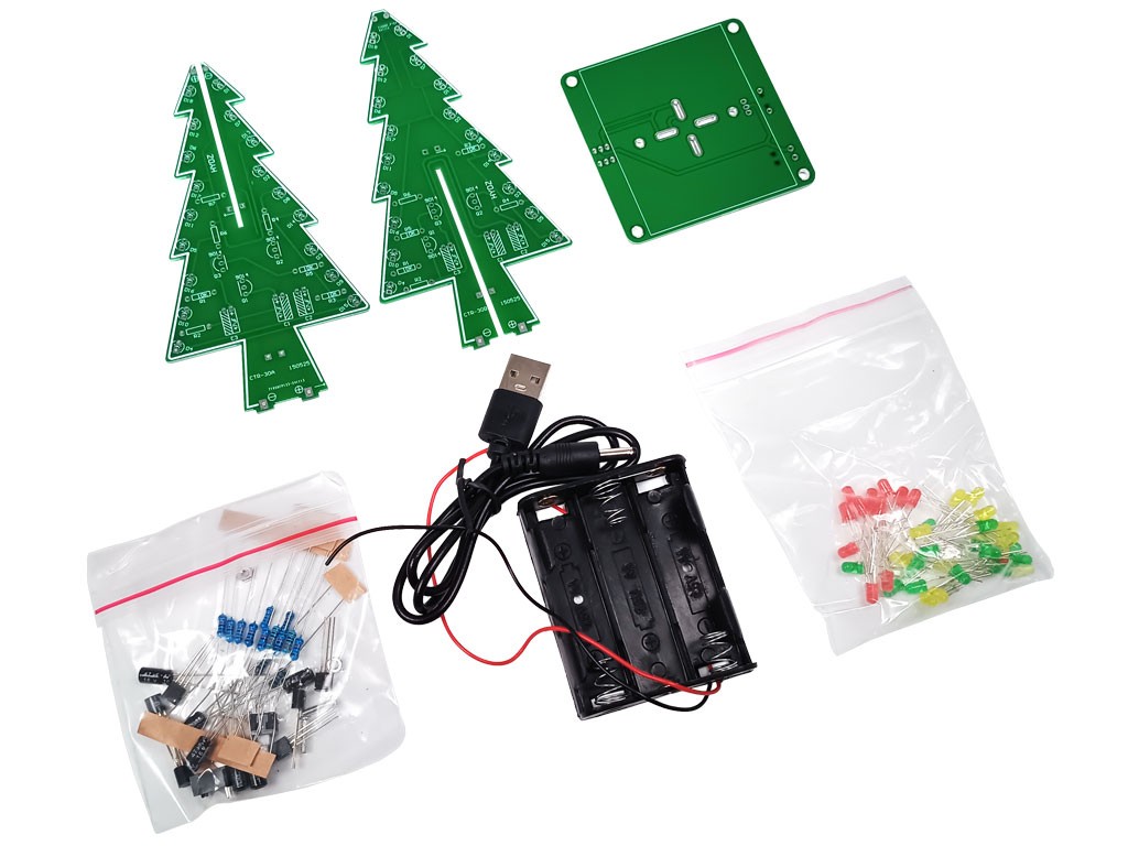 Elektronická stavebnica vo tvare 3D vianočného stromčeka ponúka jedinečné dekoračné LED osvetlenie. S 37 diódami v troch farbách vytvára efektné blikajúce svetelnú show, čo z nej robí ideálnu voľbu pre originálne vianočné dekorácie, modelárske projekty alebo ako vzdelávaciu elektronickú stavebnicu.
