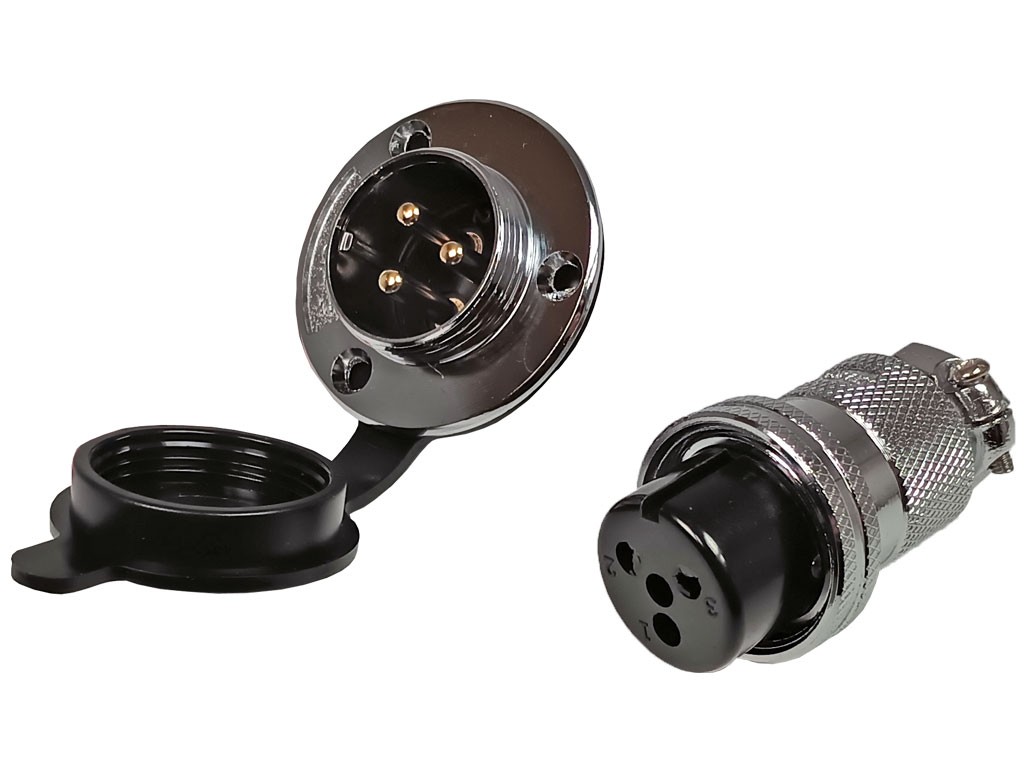 Konektor DF25 GX25, 1 pár, 3 piny, panelová zásuvka a káblová zásuvkaTento letecký konektor je určený na použitie v aviatike a predáva sa ako pár, ktorý zahŕňa 1x panelovú zásuvku (samec) a 1x káblovú zásuvku (samica).