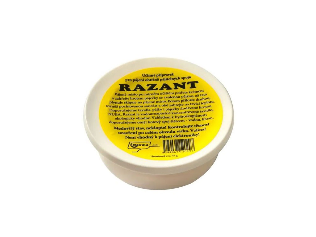 Účinný prípravok Nuba RAZANT je určený pre pájenie obtiažne pájiteľných spojov. Vďaka medovitej konzistencii sa ľahko nanáša na požadované miesto. Po zbežnom mechanickom očistení pájeného miesta je treba aplikovať krém a zahrať hrotom páječky so zvolenou pájacími zliatinami, kým pájka plynule nesmočí pájené miesto.