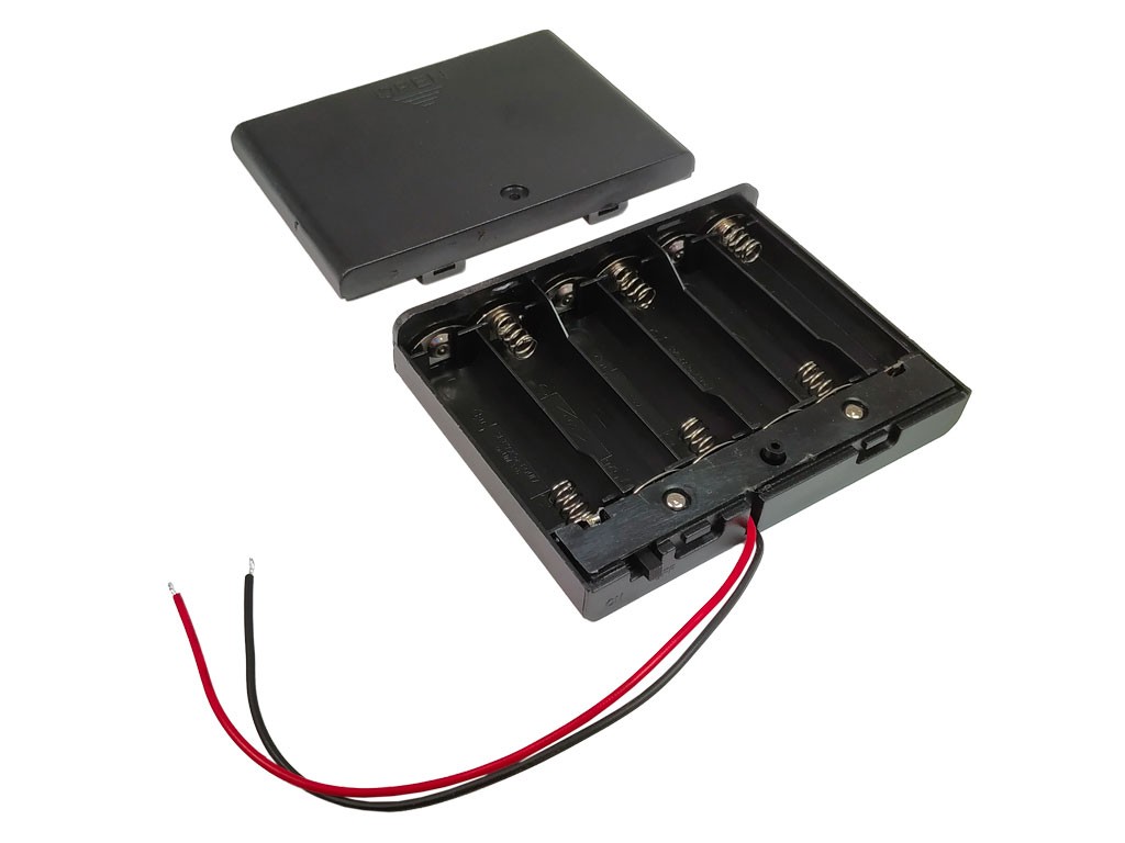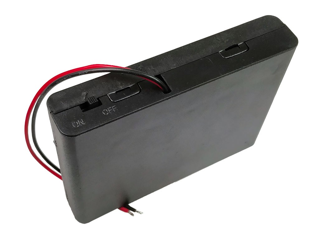 Praktické puzdro pre uchovávanie šiestich batérií typu AA. Toto puzdro je vyrobené z kvalitného plastu a je čiernej farby. Obsahuje integrovaný vypínač, ktorý umožňuje jednoduché ovládanie napájania a vývod vodiča pre pripojenie k ďalším komponentom.