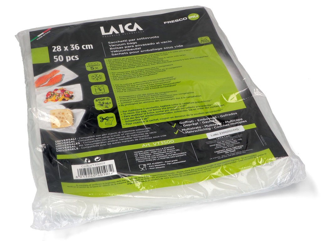 Sáčky do vakuovačky LAICA VT3500 sú ideálne pre vakuovanie potravín. Táto sada obsahuje 50 kusov sáčkov o rozmeroch 28 × 36 cm, ktoré sú vyrobené z nezávadných materiálov bez BPA. Sáčky je možné používať opakovane, majú štv vrstovú štruktúru o hrúbke 90 μm a vroubkovaný profil, ktorý zabezpečuje vysokú odolnosť a jednoduché odsávanie vzduchu. Vakuové sáčky sú nepropustné pre pachy, čo zaručuje zachovanie chuti a farby potravín. Sú vhodné pre skladovanie v chladničke, mrazničke a taktiež pre varenie metódou Sous Vide. Umožňujú dlhodobé skladovanie potravín a chránia ich pred vonkajšími vplyvmi, čím predlžujú ich životnosť až štvornásobne.