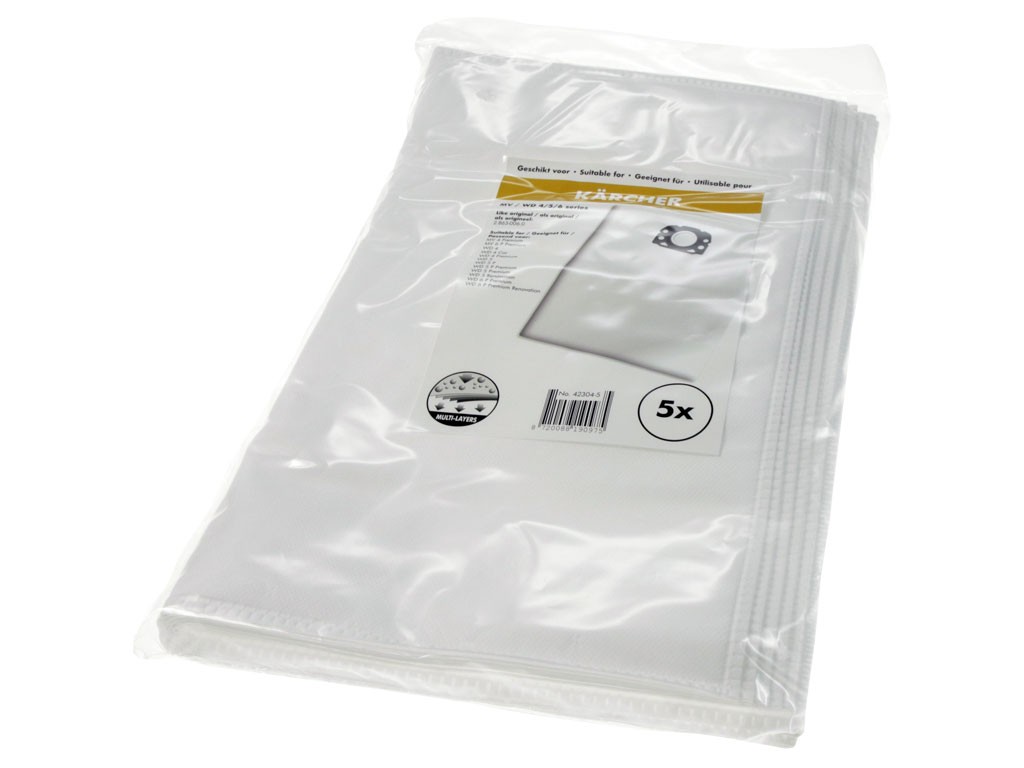 Textilné sáčky s plastovým čelom, ktoré sú určené pre viacúčelové vysávače značky KARCHER. Tieto sáčky sú extrémne odolné proti roztrhnutiu a poskytujú vysoký stupeň odlučovania prachu. Sú navrhnuté tak, aby umožnili dlhšiu dobu vysávania než papierové filtračné sáčky.