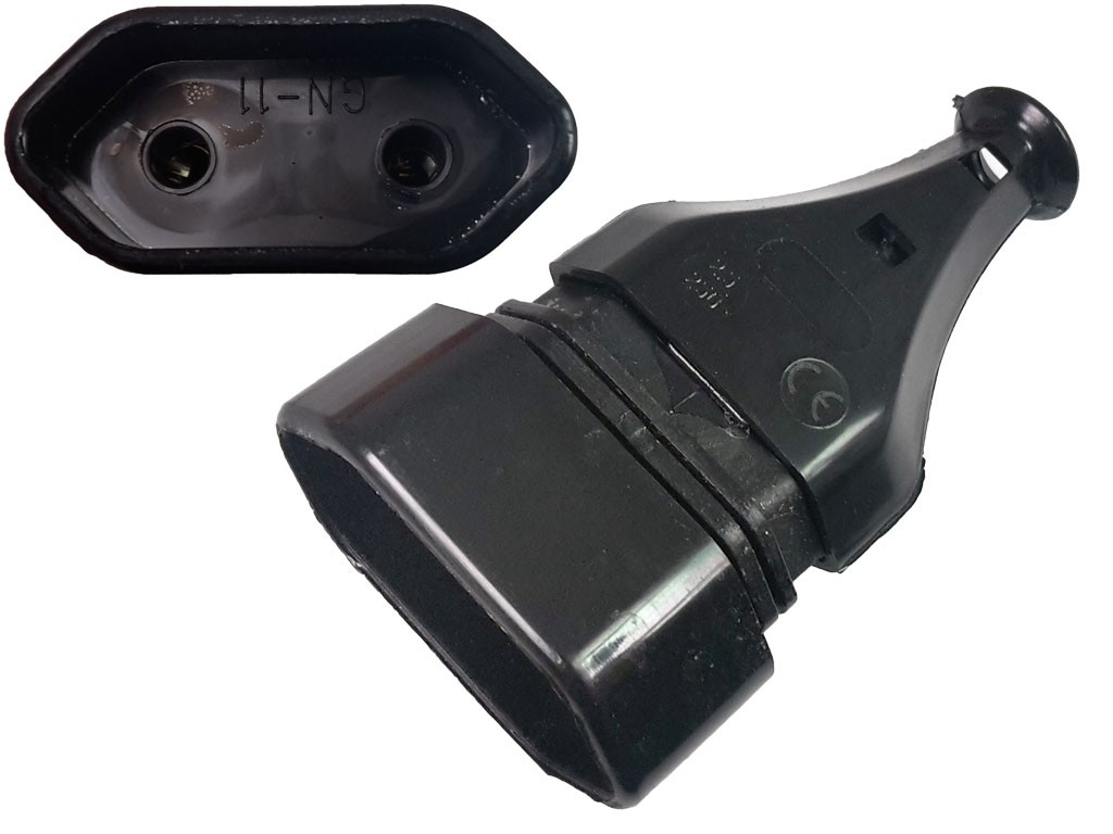 Jedná sa o čiernu dvou pólovú zásuvku bez uzemnenia, určenú pre napájanie elektrických zariadení. Zásuvka je navrhnutá pre použitie s napätím 250VAC a maximálnym prúdom 2,5A. Vďaka plochému designu je vhodná pre rôzne aplikácie.