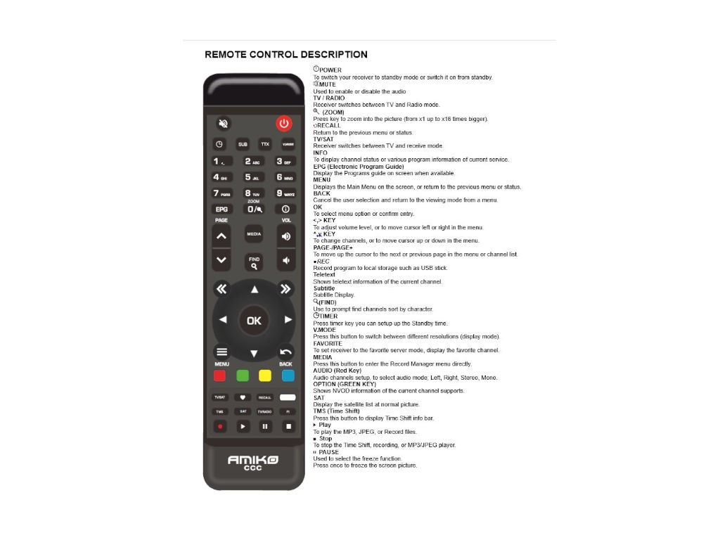 Toto diaľkové ovládanie je kompatibilné s širokým spektrom modelov značky AMIKO. Umožňuje jednoduché ovládanie televíznych prijímačov a set-top boxov. Je navrhnuté pre používateľsky prívetivú obsluhu a efektívnu funkčnosť.
