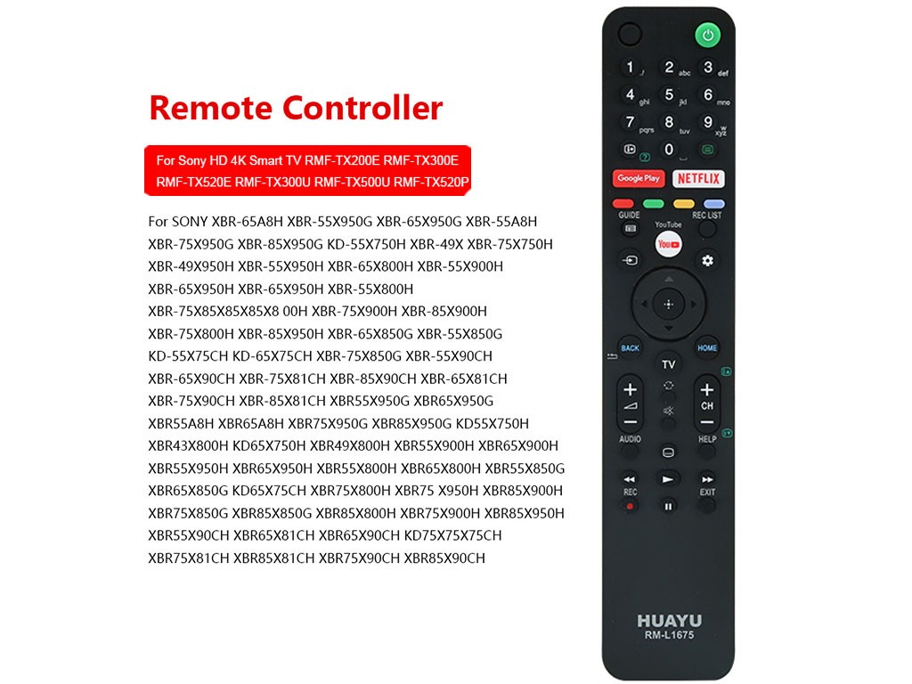 Diaľkový ovládač HUAYU RM-L1690 je navrhnutý pre jednoduché ovládanie televízorov značky SONY. Tento model je kompatibilný s rôznymi typmi televízorov a ponúka prístup k populárnym aplikáciám ako Netflix a Prime Video.